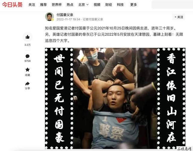 1月17日晚间,环球时报原记者付国豪的父亲通过社交网络发布消息:“知名爱国爱港记者付国豪于公元2021年10月25日晚间因病去逝,逝年三十周岁。另,英雄记者付国豪的骨灰已于公元2022年5月安放在天津憩园,墓碑上刻着:无限追息四个大字。”