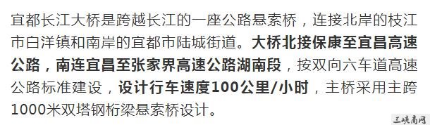 宜都长江大桥,是位于中国湖北省宜昌市的一座公路悬索桥,跨越长江,连接北岸的枝江市白洋镇和南岸的宜都市陆城街道,是呼北高速公路宜昌至张家界段的控制性工程,也是湖北省“753”骨架公路网中规划“纵6”的重要组成部分,大桥北接保康至宜昌高速公路,南连宜昌至张家界高速公路湖南段。大桥全长2,160米,按双向六车道高速公路标准建设,设计行车速度100公里/小时,主桥采用主跨1000米双塔钢桁梁悬索桥设计大桥项目估算总投资37.73亿元人民币,计划建设工期为48个月。
